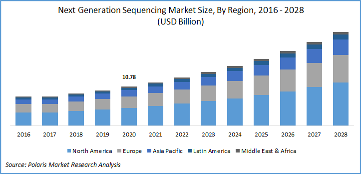 2020年,全球下一代测序市场价值为107.8亿美元,预计在预测期内将以11.7%的复合年增长率增长。市场因素包括技术创新、高通量筛选、成本降低、下一代测序(NGS)平台的低错误率、政府资助的基于人群的研究、分子生物学和临床遗传学的研究和创新。以及通过计算工具分析分子水平(基因)数据的进步。